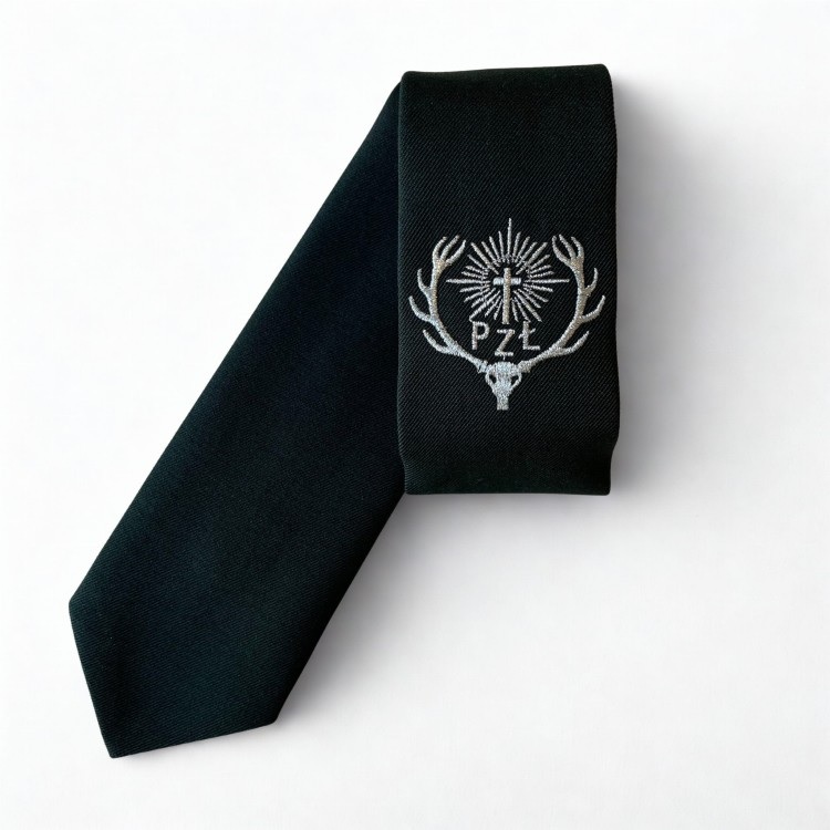 Zielony krawat logiem PZŁ w kolorze srebrnym haftowany metalizowaną nicią.