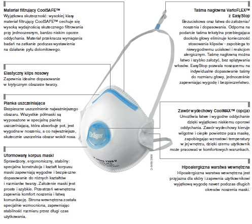 | Materiał filtrujący | CoolSAFE™ do ochrony przed stałymi i płynnymi cząsteczkami (nie przed lotnymi) |