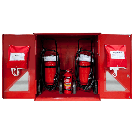 Szafa pozwala na przechowywanie podręcznego sprzętu gaśniczego zgodnie z Rozporządzeniem Ministra Spraw Wewnętrznych i Administracji z dnia 19 lutego 2020 r. „w sprawie wymagań w zakresie ochrony przeciwpożarowej, jakie mają spełniać obiekty budowlane lub ich części oraz inne miejsca przeznaczone do zbierania, magazynowania lub przetwarzania odpadów” w postaci: 2 gaśnice przewoźne 25 kg, 2 gaśnice przenośne, dwa koce 2 x 3 m.